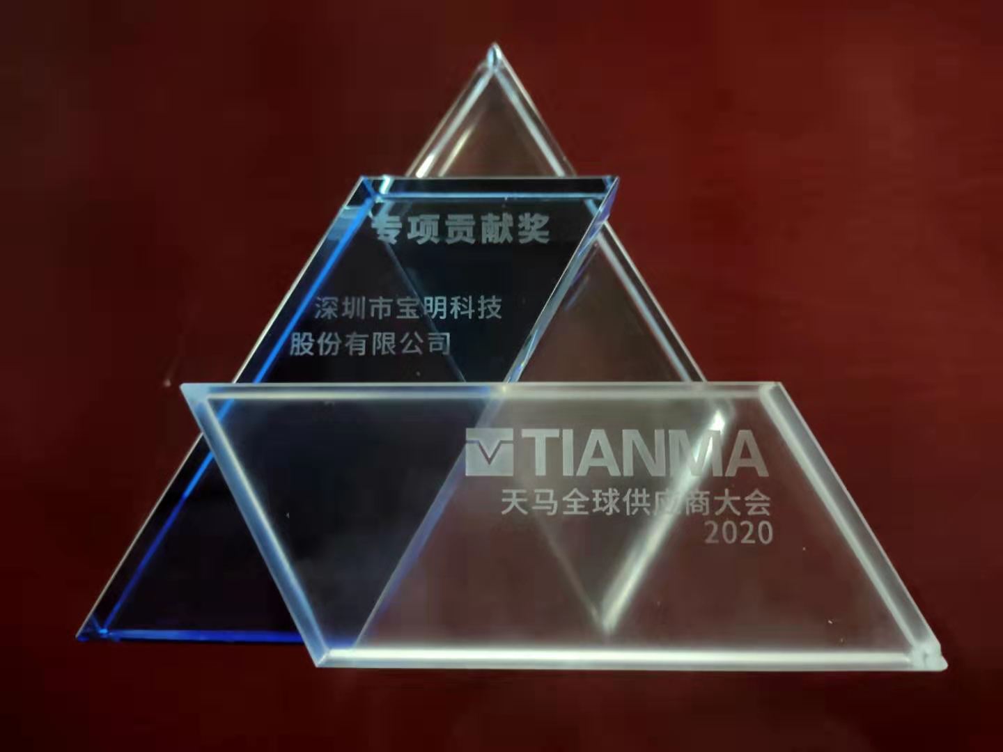 大會(huì)現(xiàn)場,天馬向表現(xiàn)卓越的40家供應(yīng)商頒發(fā)了多項(xiàng)獎(jiǎng)項(xiàng)。寶明科技在2020年疫情影響下,以客戶為導(dǎo)向,第一時(shí)間復(fù)工復(fù)產(chǎn),同時(shí)在生產(chǎn)全自動(dòng)化和信息化上加大投資,不斷提升品質(zhì)和效率,保障了客戶的交付和品質(zhì),獲得了天馬的認(rèn)可,并榮獲天馬“2020年度專項(xiàng)貢獻(xiàn)獎(jiǎng)”榮譽(yù)稱號(hào)。