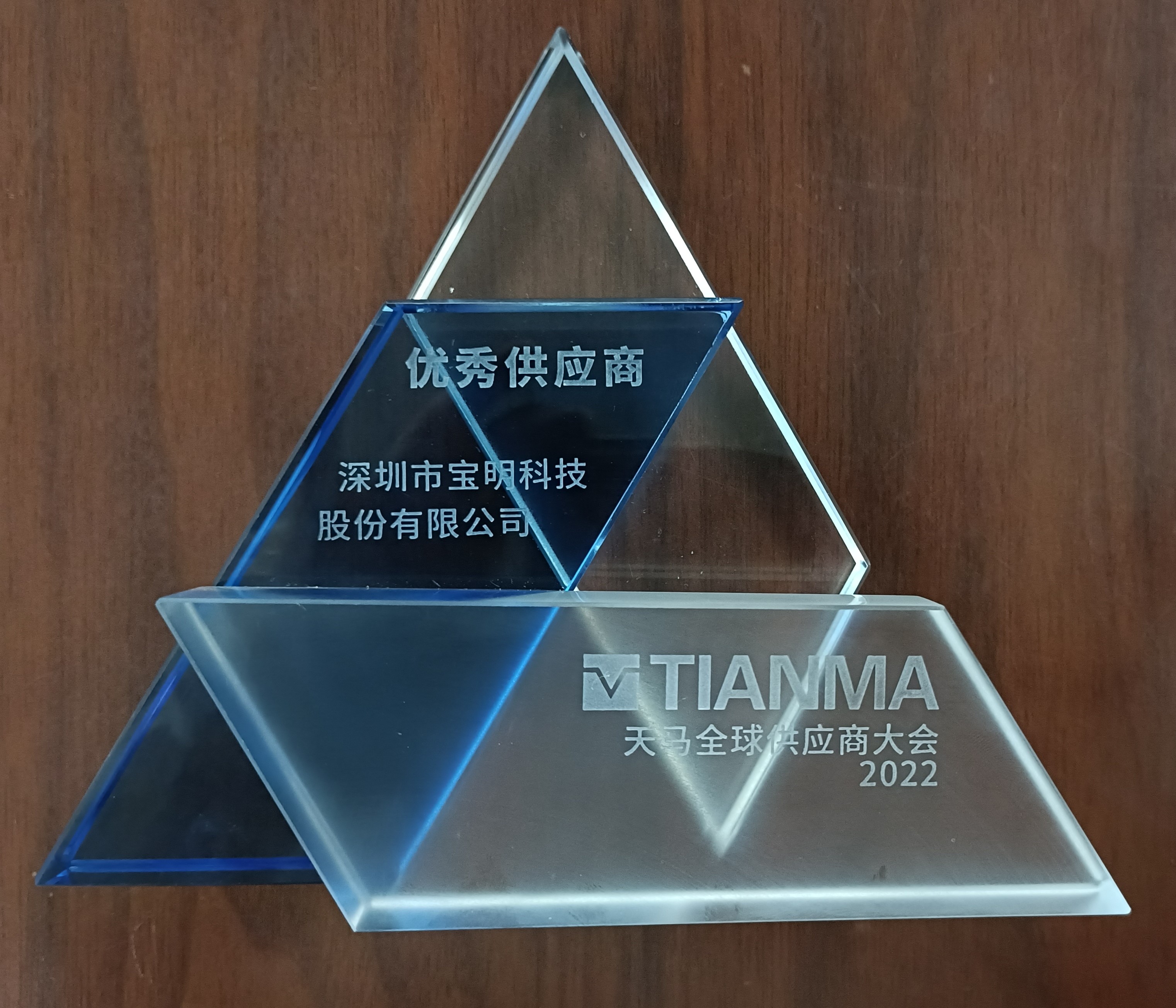 寶明科技在天馬2022年評(píng)比活動(dòng)中,以“品質(zhì)、交期、服務(wù)”各方面綜合良好表現(xiàn)獲評(píng)2022年度“優(yōu)秀供應(yīng)商”,并獲獎(jiǎng)杯。