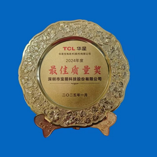 2025年1月7日,寶明科技憑借卓越的產(chǎn)品質(zhì)量與服務(wù),斬獲TCL 華星華顯光電客戶頒發(fā)的2024年度 “最佳質(zhì)量獎”。這一份量最重的獎項是客戶對我們在質(zhì)量管控、技術(shù)創(chuàng)新及交付能力上的高度認(rèn)可。
